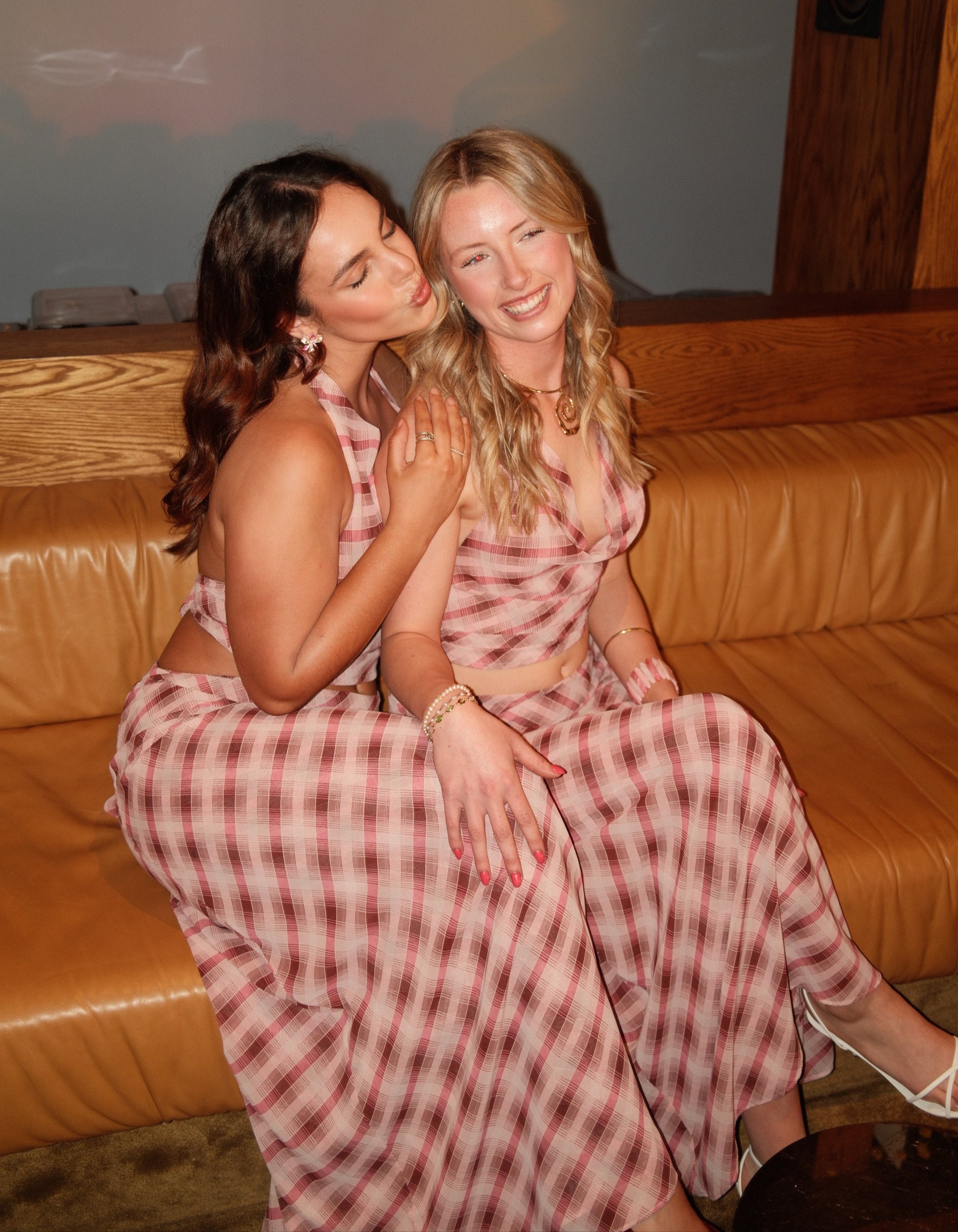 Top featuring tie up across back and neck to adjust to your perfect position. Skirt features a zip down the back.